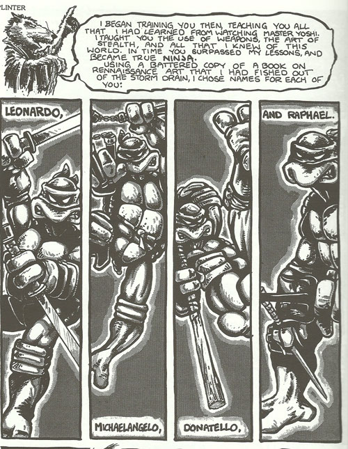 Lots of people have spell-checkers on their computers. My spell-checker, much like yours, would like to correct what I wrote here, because it thinks it’s a typo. But the fact of the matter is that Michelangelo was an artist, and Michaelangelo is a turtle. I will demonstrate, with a scan from this book I found on my shelf: