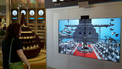 In the center of the store there is a cafe area. Just off to the side, where the large bins of Kisses are, is a relatively new interactive installation run on an XBox Kinect.